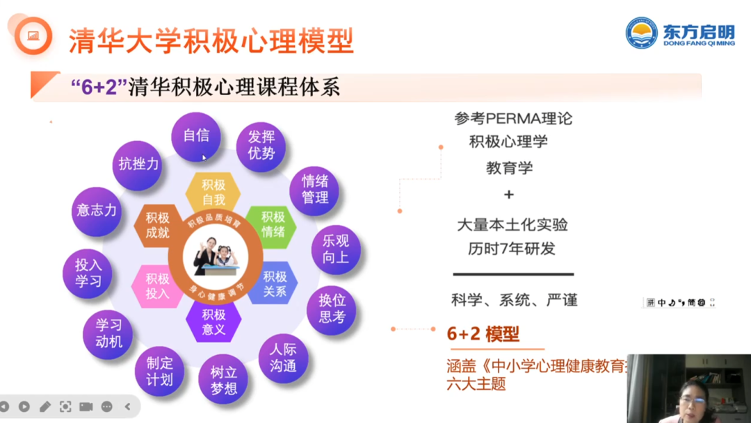 在“积极心理学的科学基础与PERMA模型”部分,讲座系统介绍了马丁·塞利格曼提出的PERMA幸福理论,包括积极情绪、投入、人际关系、意义与成就五大支柱,并结合清华大学“6+2”积极心理课程体系,详细阐释了六大模块(积极自我、情绪、投入、关系、意义、成就)与两大系统(身心健康调节系统、品格优势与美德培育系统)的实践路径。