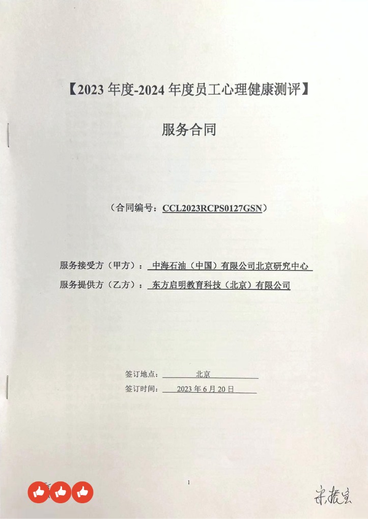 企业最大的财富是健康、幸福、高效的员工,东方启明将凭借过硬的专业水平和独有的平台优势,协助中海石油(中国)有限公司北京研究中心圆满完成2023年度-2024年度员工心理健康测评工作,关注员工心理健康,提升工作幸福感,助力企业稳步发展!