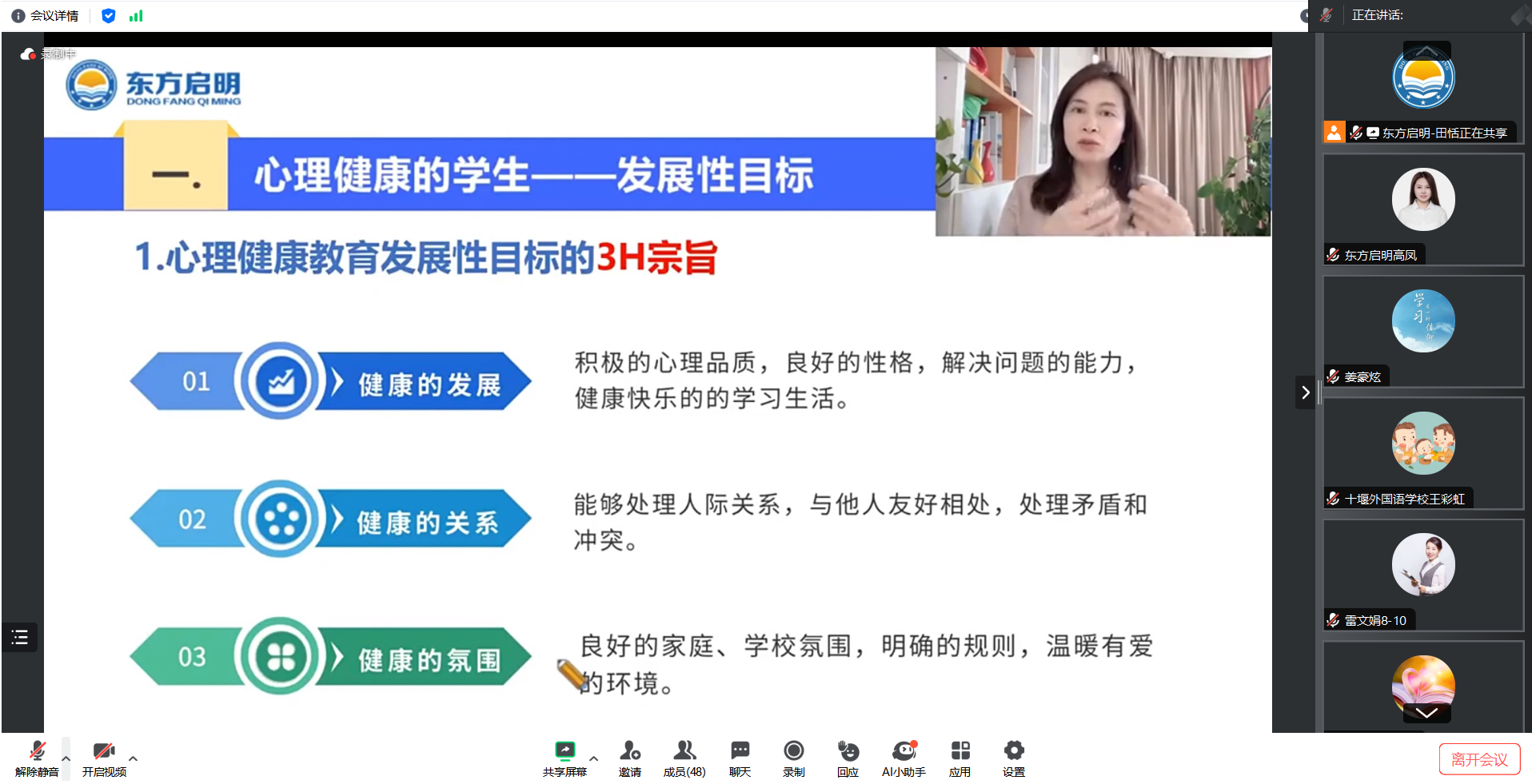 首先,茅箭区教育局学生健康发展股姜豪炫股长在讲话中强调到,一要高度重视,充分认识学生心理健康教育工作的重大意义;二要严格落实,科学规范严谨细致的完成相关要求;三要加强学习,不断提高专兼职心理健康教育教师们的综合素质。把学生心理健康教育工作作为一项重要政治任务和经常性、基础性工作,切实抓紧抓实抓好!