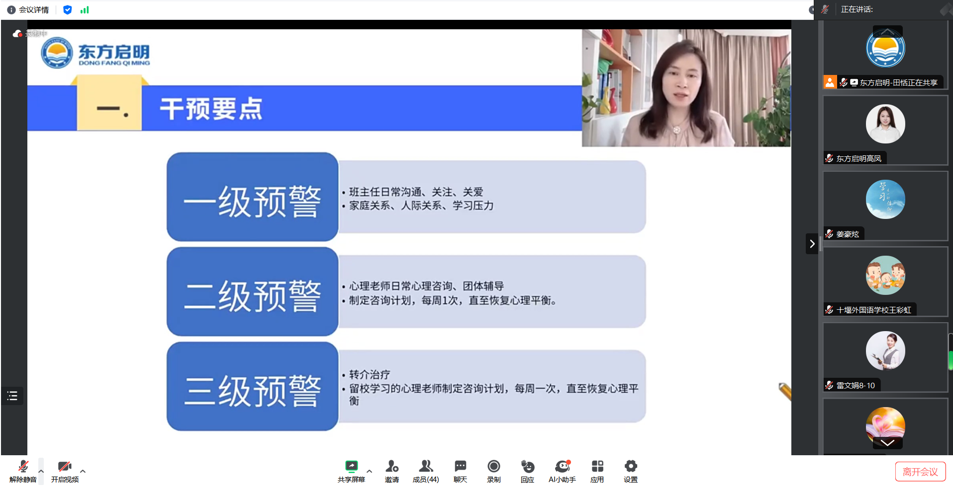 接下来,东方启明心理健康研究院副院长苏迪博士进行了本次心理测评总结报告解读,并针对后续预警干预工作开展了专题培训,围绕如何采取分级预警和分类干预的具体措施重点讲授,并为参会的全体老师实时答疑解惑。