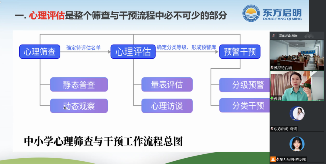 为了进一步全面推进建设“中小学心理健康教育示范旗”东方启明心理健康研究院、东方启明教育科技(北京)有限公司继为苏尼特右旗所有中小学提供启明心理云平台之后,继续提供心理健康教师能力培训支持,于2022年4月20日下午15:00,召开“如何做好心理评估工作的专题线上培训”,以提升专兼职心理健康教育教师心理评估的知识和专业技能,更好的执行学生心理评估工作。东方启明心理健康研究院副院长、苏迪绘画心理学研发导师、中国科学院心理研究所发展与教育心理学博士苏迪女士受苏尼特右旗教育局邀请,为全旗中小学专兼职心理老师提供本次培训。