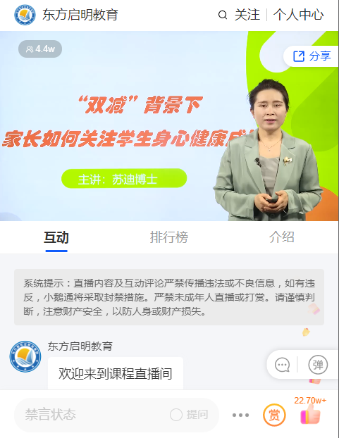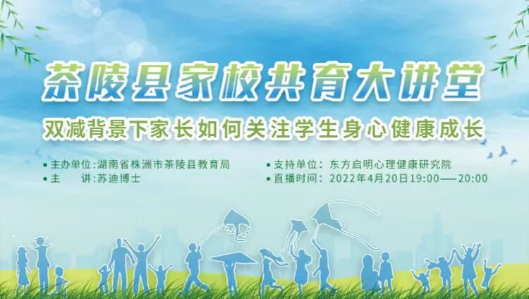 2022年4月20日晚19点,《双减背景下,家长如何关注学生身心健康成长》线上家长课堂讲座成功举办。本次《双减背景下,家长如何关注学生身心健康成长》家长课堂讲座由湖南省茶陵县教育局主办东方启明心理健康研究院提供支持由中国科学院心理研究所发展与教育心理学博士——苏迪女士主讲。全县万余名家长在线聆听了北京专家的讲座,讲座引起广大家长的共鸣。