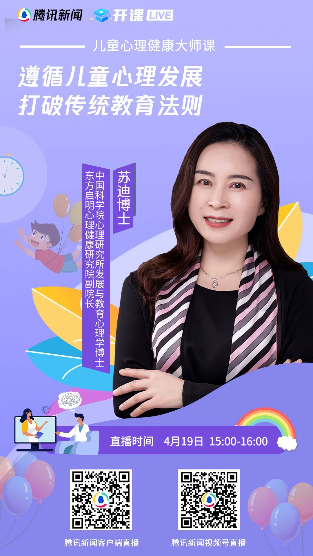 2022年4月20日,东方启明心理健康研究院副院长、中国科学院心理研究所发展与教育心理学博士、《苏迪绘画心理学暨心理咨询师研修班》系列课程研发及主讲——苏迪女士,受邀前往腾讯新闻直播儿童心理健康大师公开课。