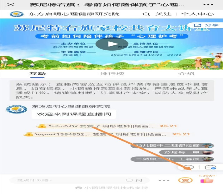 此次培训充分发挥“互联网+教育”优势,引导家长正确理解、接纳有情绪的自己。家长们在专家老师的带领下,有效地释放和缓解了考前负面情绪,掌握了迎考心理知识,调整最佳心理姿态的方法。为我旗考生逐梦前行的旅程输送心灵力量、整理“备考”行装。本次讲座也非常收到家长的认可,苏迪博士从19点开始讲座,共持续1小时,累计总观看人次6千,累计点赞1.39万次。